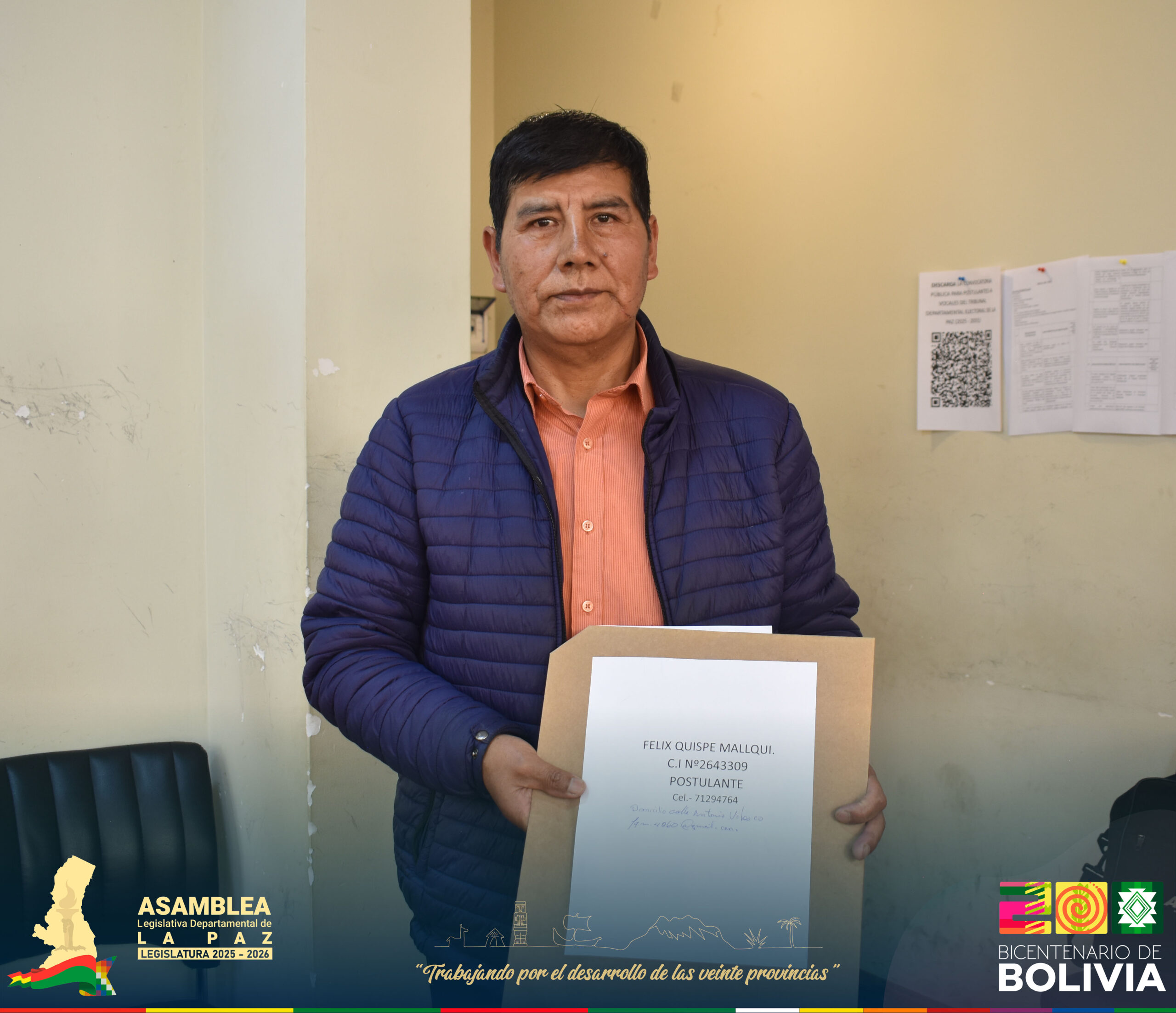 Durante la segunda jornada de recepciรณn de documentaciรณn, desarrollada este domingo, se presentรณ el postulante Fรฉlix Quispe Mallqui, con C.I. 2643309 LP, quien entregรณ su documentaciรณn ante la Comisiรณn Especial de la ALDLP.